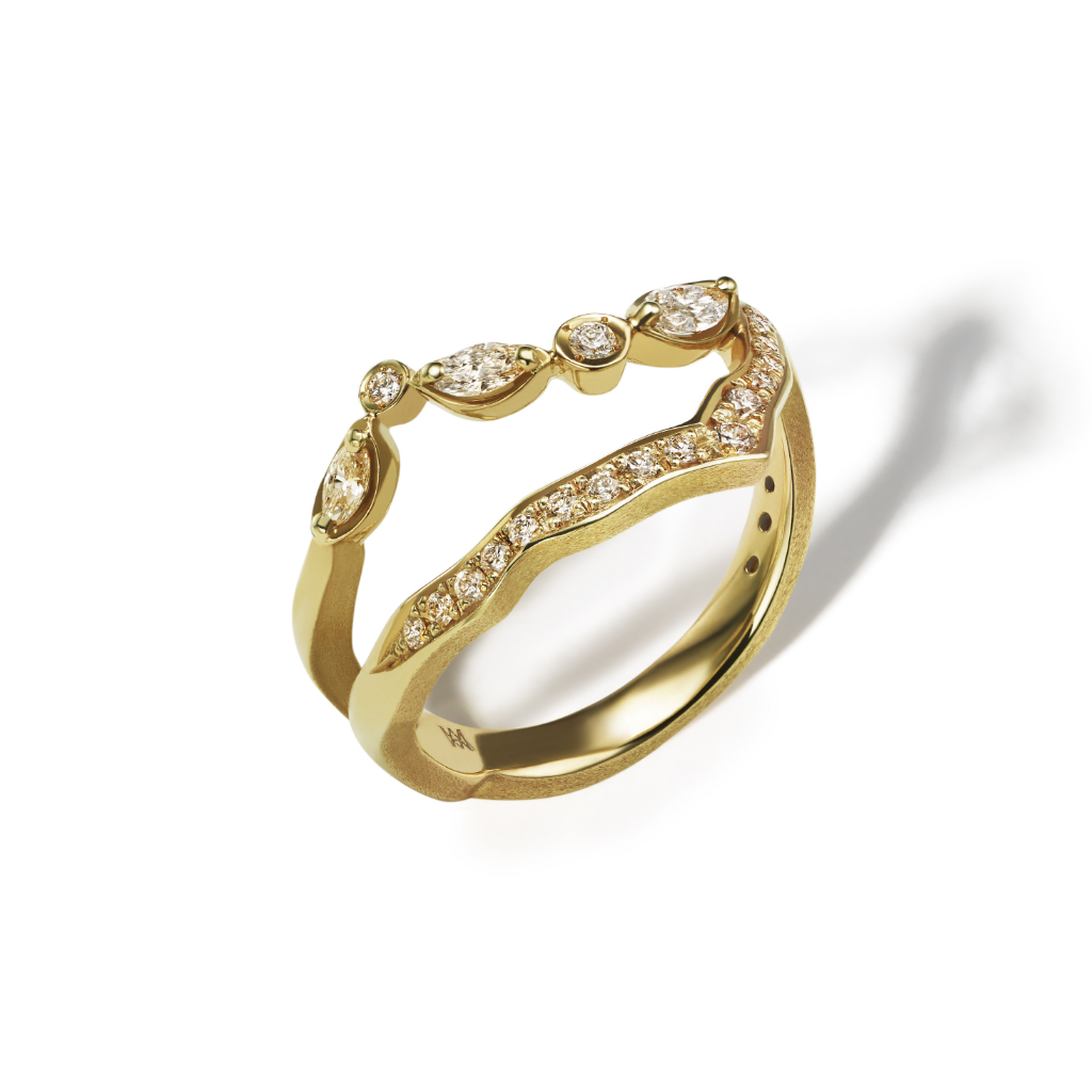 KINTSUGIコレクションのアイコンのひとつでもあるKINTSUGIリングⅠに、ダイヤモンドをパヴェ使いであしらいました。一見ランダムに配置されたダイヤモンドだが、まるで指元がダイヤモンドで継がれているかのようにデザインされています。輝きの強いダイヤモンドを使用し、存在感のある指元を演出します。