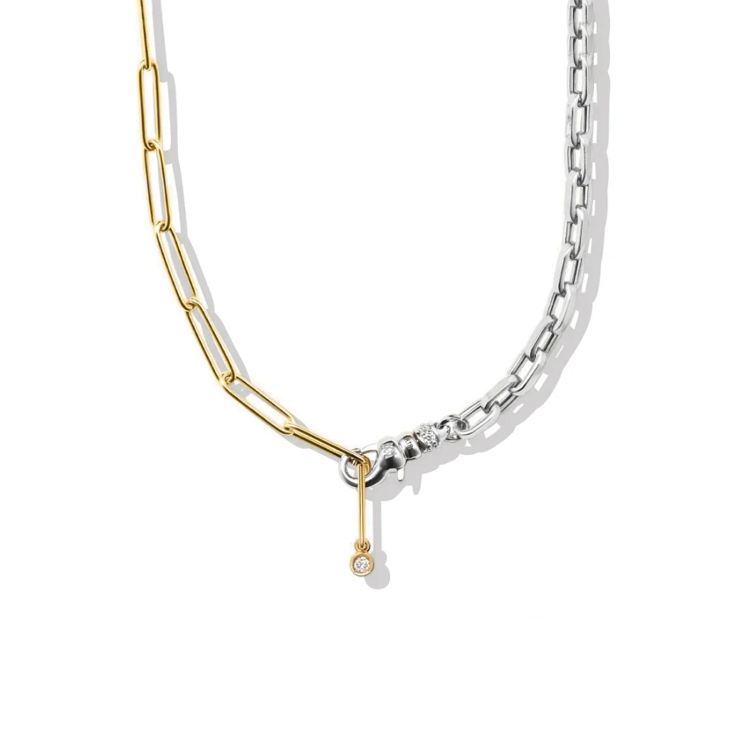 ペーパークリップチェーンとアンカーチェーンの組み合わせが美しく繊細なデュオチェーンJr.。ペーパークリップ側の先端に一粒ダイヤモンド、クラスプにもダイヤモンドをあしらいました。チェーンの長さが可能で、スタイリングも自由自在。お好きなチャームをつけて、ぜひパーソナライズも楽しんでください。