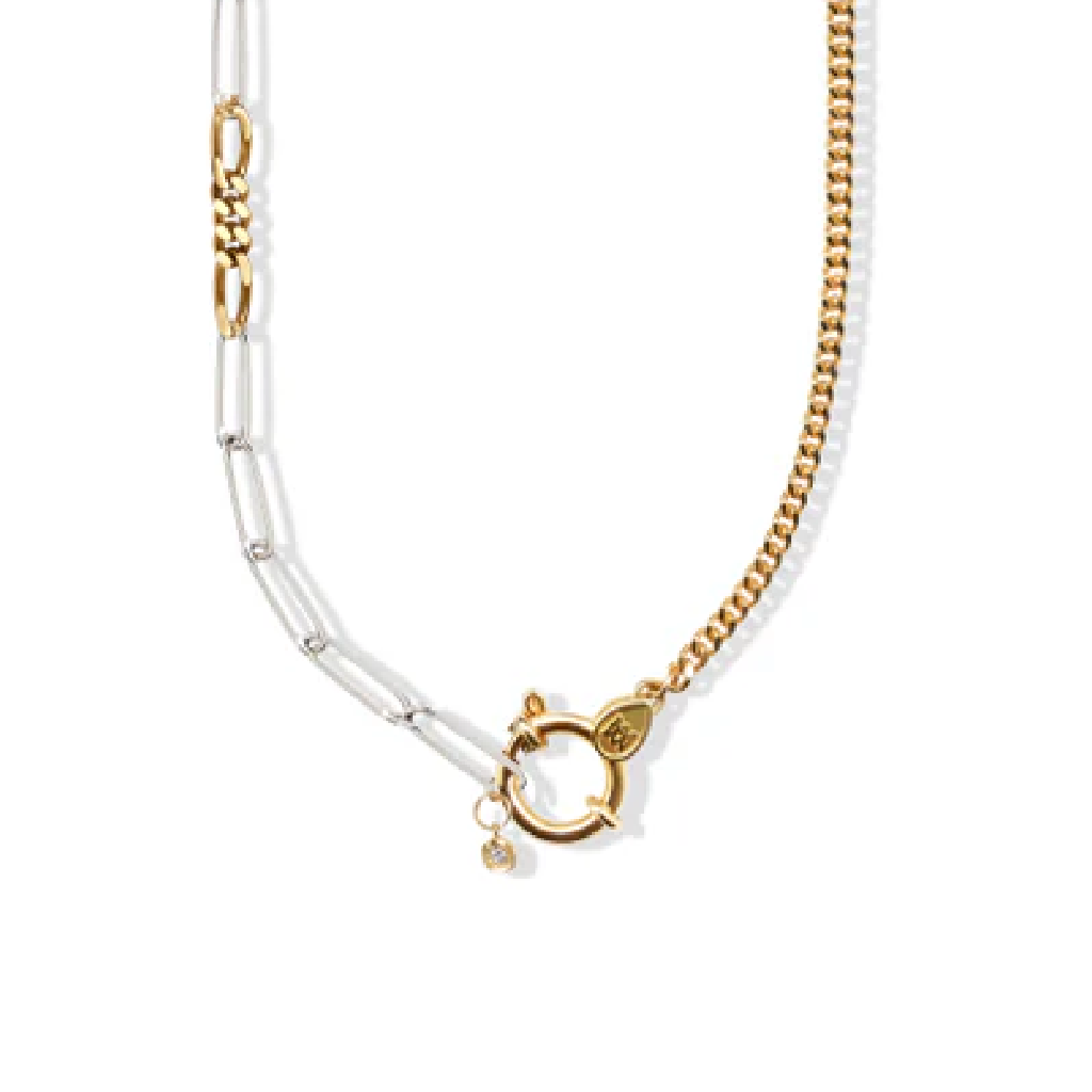 デュオチェーンⅥは デュオチェーンⅢ のアップグレードバージョン。タイムレスな喜平チェーンに、ペーパークリップチェーンとフィガロチェーンを組み合わせました。クラスプには一粒のダイヤモンドをあしらい、金継ぎのディテールも光る一本です。