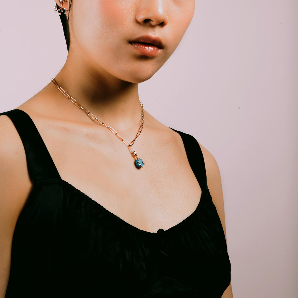 同じ形がないそれぞれ一点もののターコイズに18金イエローゴールドでKINTSUGIデザインを施したスペシャルチャーム。チャーム上部のフック部分は、チェーンのお好きな場所に付けてスタイリングを楽しんでいただけるよう、内側に開く仕様になっております。チェーンやネックレス等に付けて着用いただく場合、付けた後に完全にフックが閉じきっているかご確認の上ご着用ください。