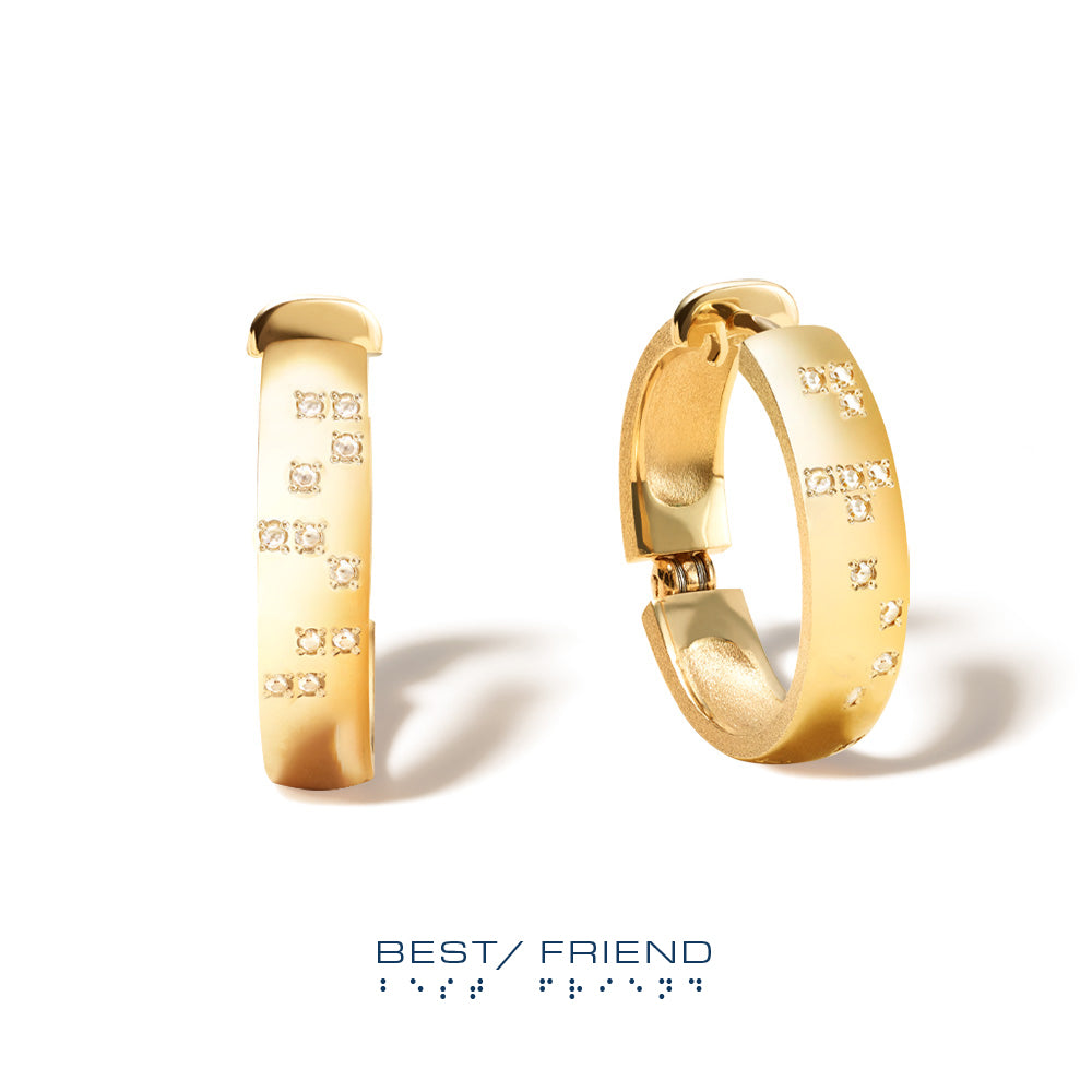 「触れて、言葉を感じる」がコンセプトの点字ダイヤモンドフープピアス。18金イエローゴールドのフープピアスには、片方には「BEST」、もう片方に「FRIEND」の文字が、触れて読み取れるダイヤモンドの点字で表現されています。美しく光るラウンドブリリアントカットのダイヤモンドを逆さまにセッティングすることで、点字でさりげなく綴られています。