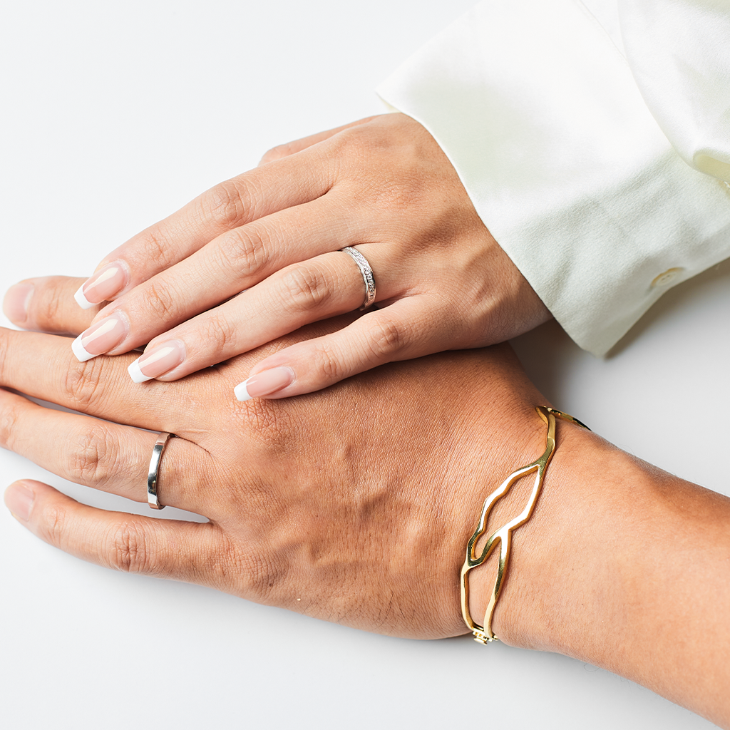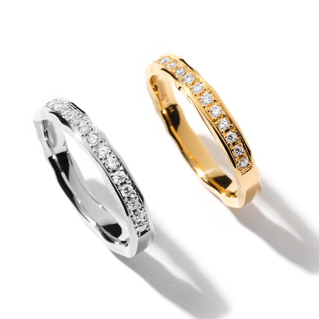ENリングは、永遠の愛と約束を象徴するに最適なブライダルリング。 ENは日本語でまさに「ご縁」を表し、ふたりのご縁を強く結びつけます。このリングは天然パヴェダイヤモンド、マット仕上げで、側面に洗練された金継ぎのディテールが施されており、ミラモアならではなシンプルでユニークなデザインに仕上がっています。数々の苦難を乗り越え歩んでいく二人の姿に、修復し美しさを増す金継ぎのフィロソフィーを込めて。ほかにもダイヤモンドのない地金バージョンもあります。