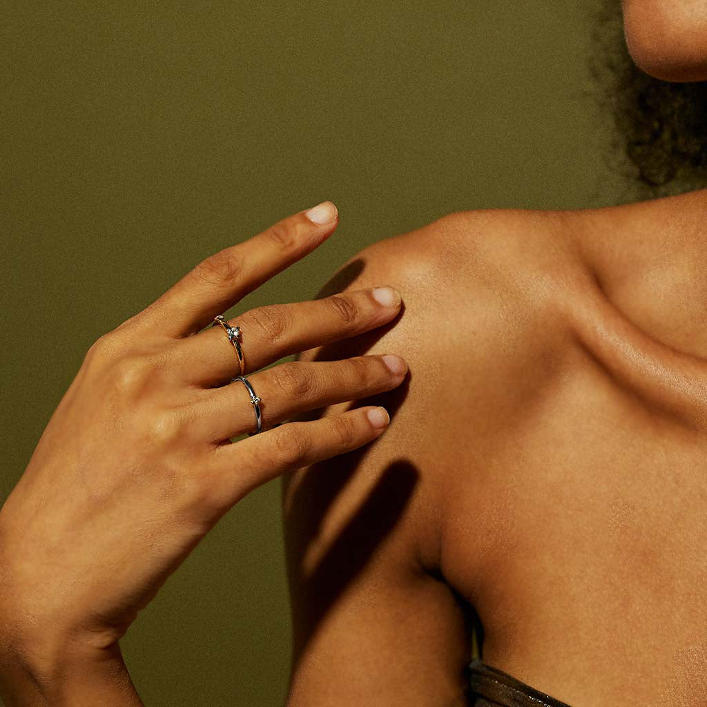 K18イエローゴールドとK18ホワイトゴールド、ダイヤモンドで花火の火花を表現したリング。キラキラと手元が輝きます。一つだけで着けてもよし、重ね付けを楽しんでもよし。他のリングと喧嘩しないデザインなので、デイリーにお使いいただけます。